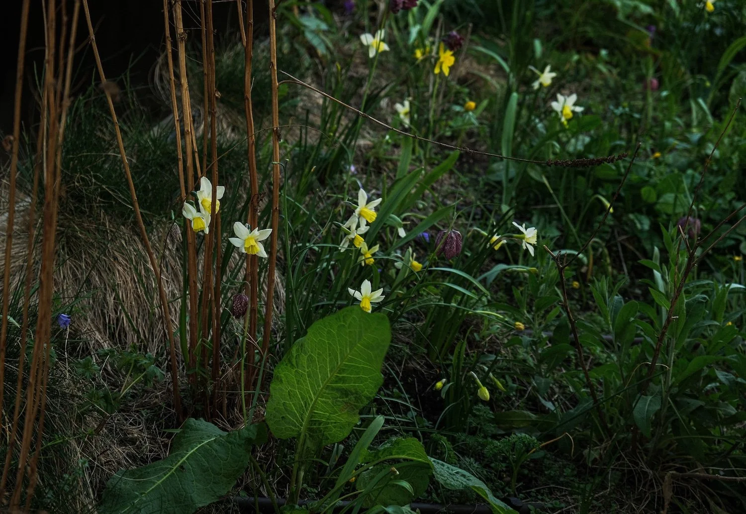 Here you can see in bloom; yellow Narcissus ‘Sailboat’, the bluish purple of Anemone blanda, and the nodding heads of snakeshead fritillary, Fritillaria meleagris